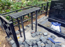 Первым делом мы демонтировали с территории участка кресты и ограждение, параллельно готовя землю к брусчатке. Когда подготовительные работы были завершены мы установили оградке, по низу которой сделали периметр из опалубки для последующей заливки бетоном.