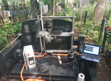 Приносим на место захоронения всё необходимое оборудование: гравировальный станок, блок управления и ноутбук, к которому подключается прибор. Переходим к гравировке. Сначала мы наносим надпись, затем переходим к портрету.